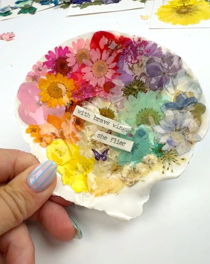 This pressed flower shell craft is a beautiful way to bring together florals and ocean treasures. Each resin shell becomes a one-of-a-kind canvas that highlights the delicate beauty of pressed blooms. Whether you display it on a shelf, gift it to a friend, or use it as a small trinket dish, the result is both simple and stunning. It’s a relaxing, creative project that doesn’t require perfection…just a love for nature and a little imagination.