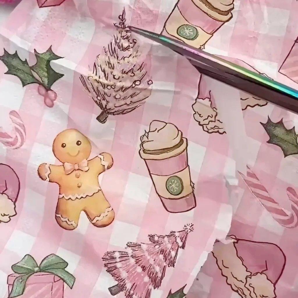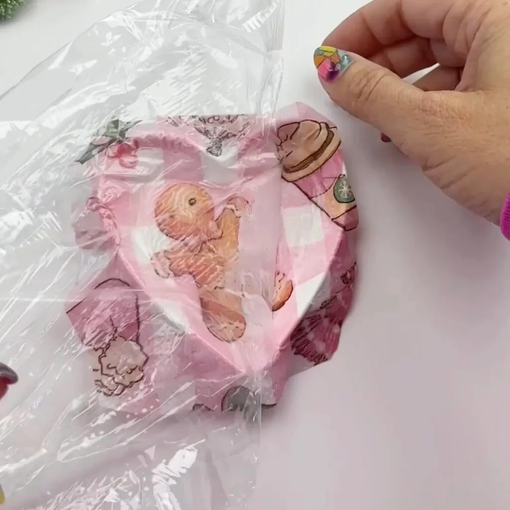 Step 4. Lift the plastic wrap and flip it so the napkin is facing up, then set it onto the surface you’re decorating. While the plastic wrap is still on top, use your fingers to press down and gently smooth out any wrinkles or air pockets.
