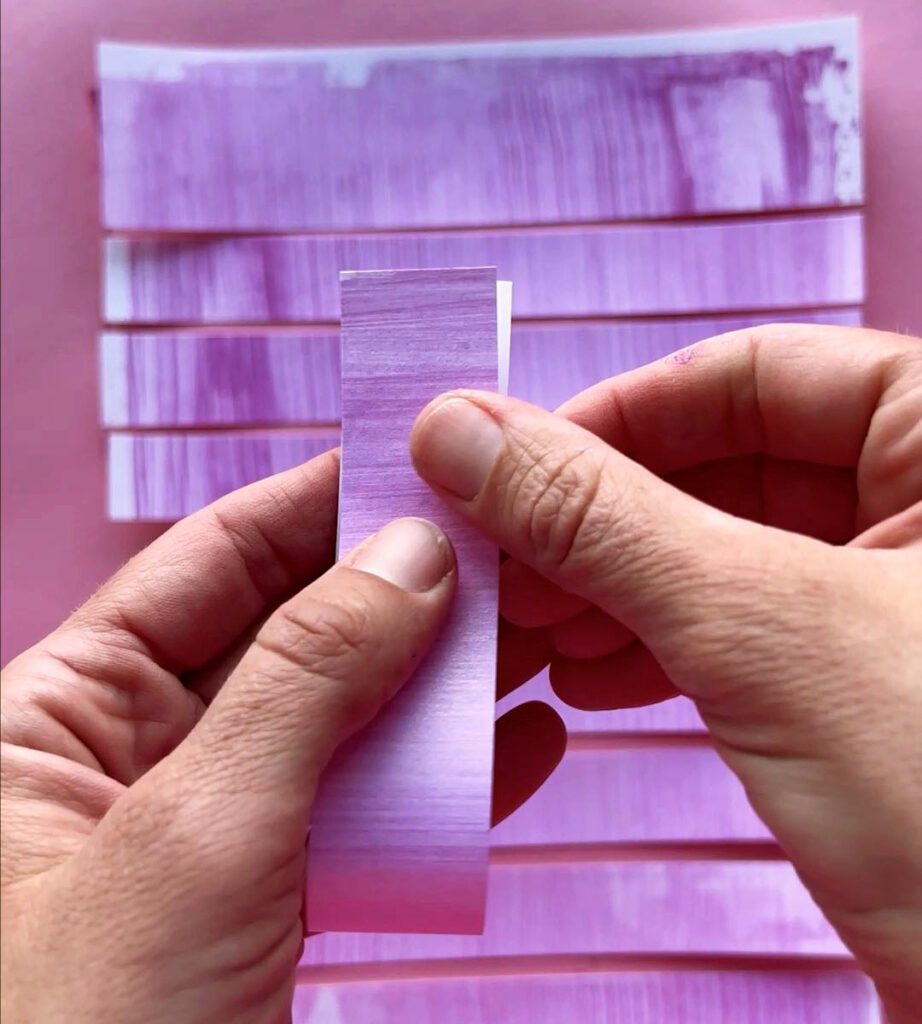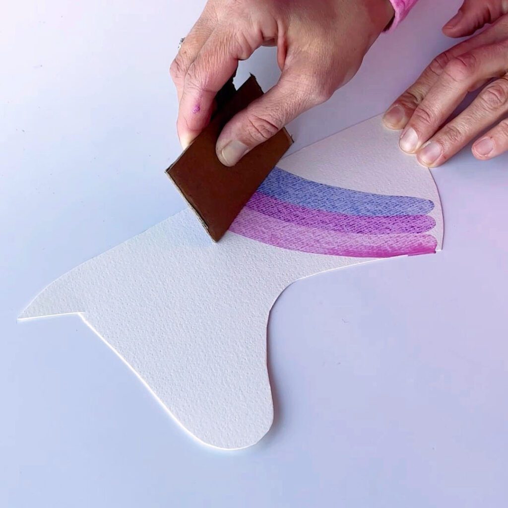 Step 11: In the meantime, you can prepare your background paper for the unicorn. Squeeze a little bit of blue and purple acrylic paint (or any colors you choose) onto the watercolor paper. Use the scrape technique, using a piece of cardboard to spread the paint. Â