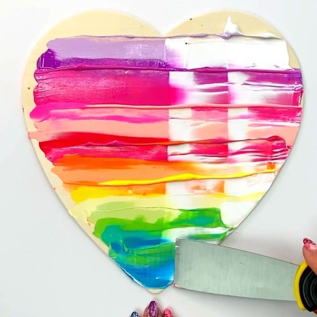 - I started with the acrylic paint in rainbow colors across the entire top of this painted heart. I used this wooden heart. This is another great wooden heart option.