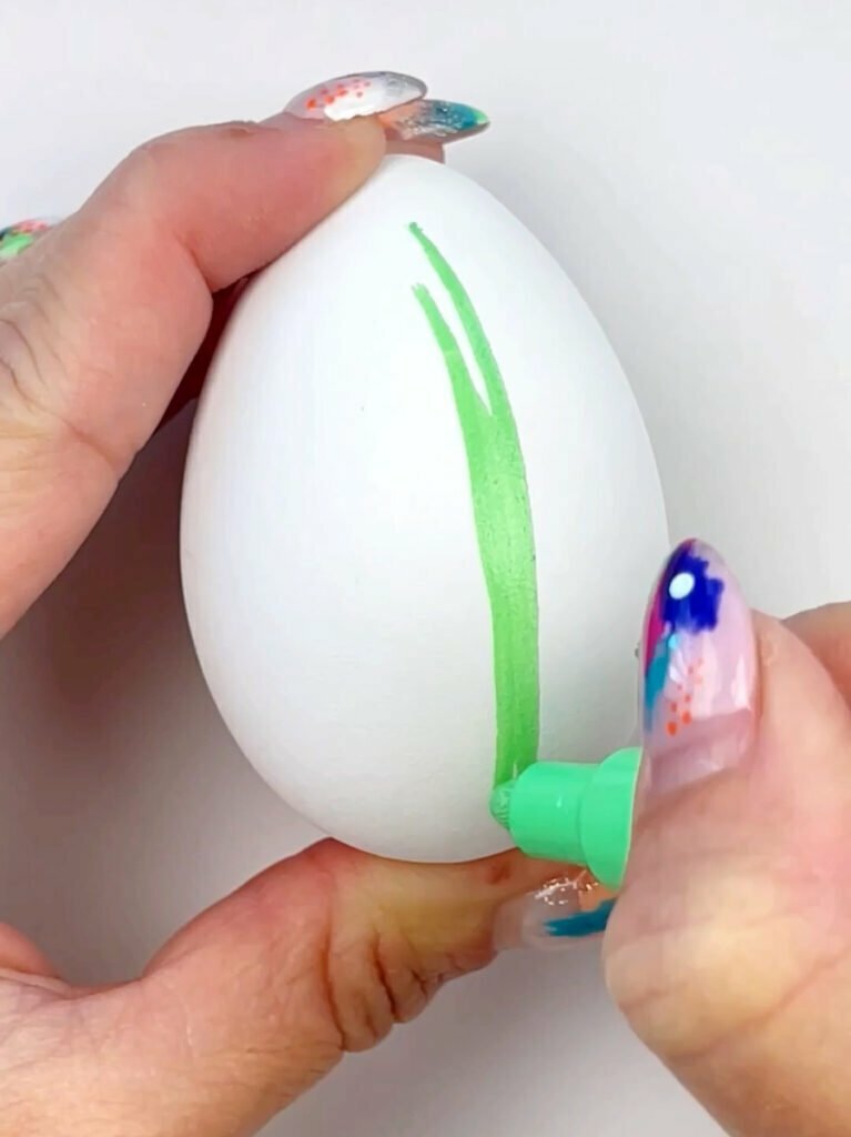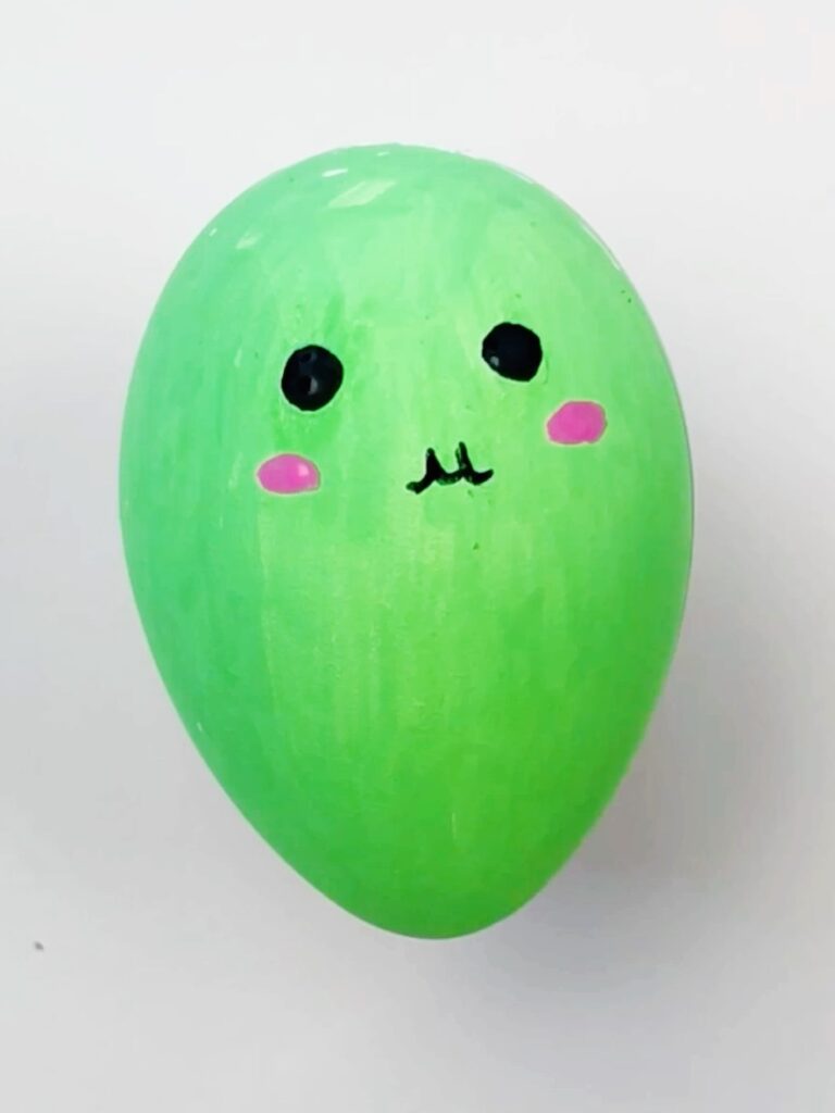 - First, start by painting your egg in a shade of green. If you’re using acrylic paint, a flat paint brush will work best to cover the egg in a smooth layer of paint. If you are using paint markers, I suggest using a medium sized tip.