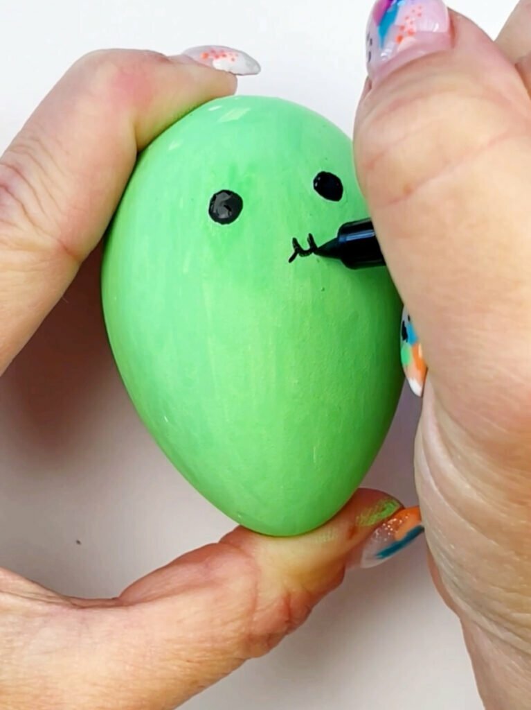 - After your paint is completely, draw the face of the cactus using pencil first. To check if you like the placement of the face, add the egg to the flower pot to make sure it’s in a good spot. Once you like the placement of the eyes and mouth, use an extra fine paint pen or a small paint brush and black paint to add in the facial features.Â
