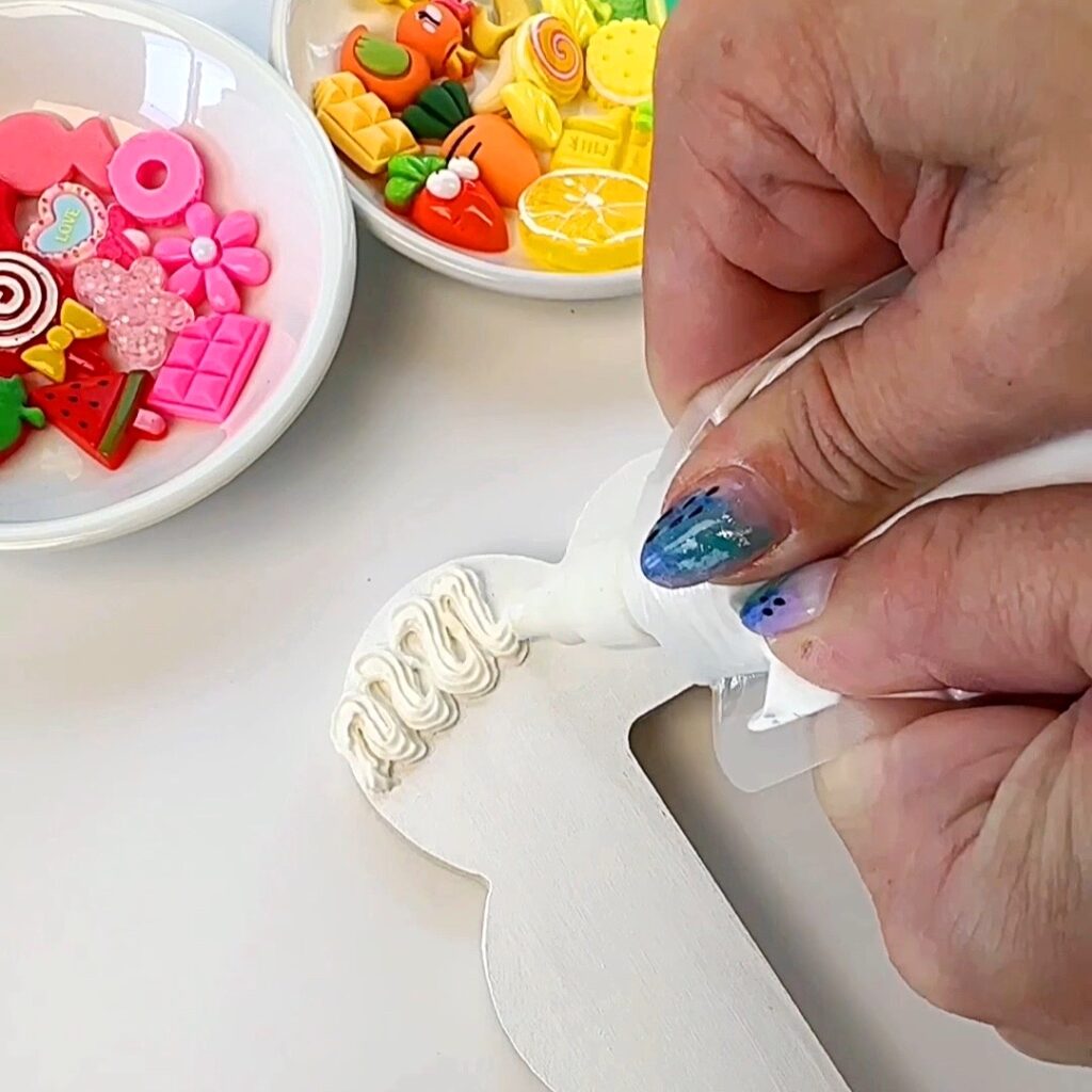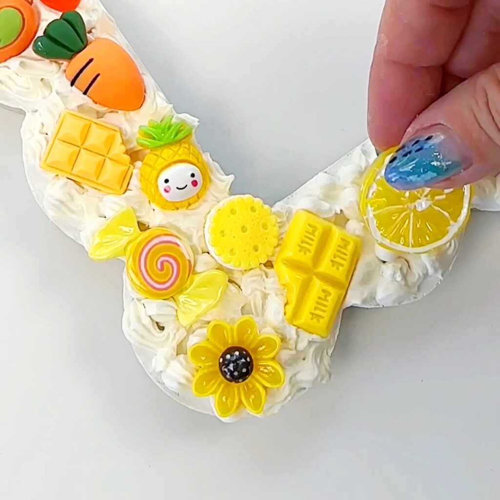 Step 4. Once the clay frosting has been adding, place your charms on top of the frosting. You only need to slightly press down. I recommend getting an idea of where you want to put the embellishments before you start adding them as it can be a bit messy to move them.